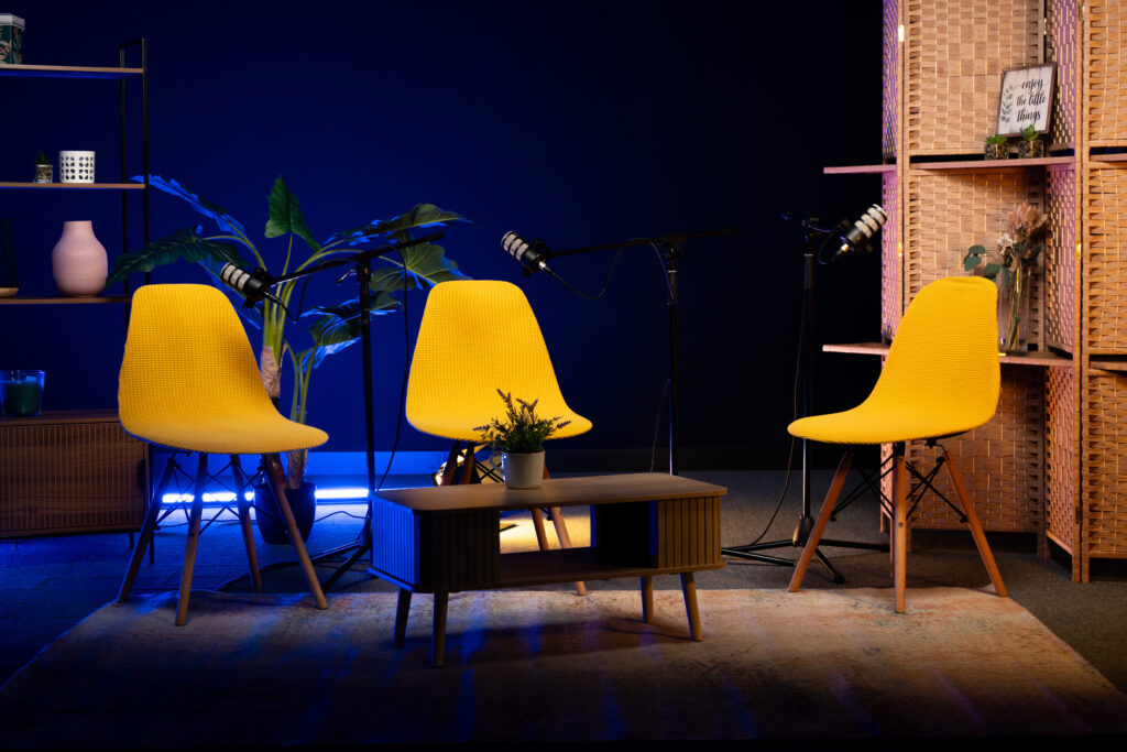 Disponemos de un espacio flexible que se adapta a cualquier proyecto. Contarás con diferentes fondos, sillas, sillones, plantas y elementos decorativos. Todo con el objetivo de que puedas personalizar el espacio a tu gusto y con el estilo que desees para tu podcast.
